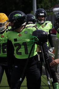 Am Sonntag, dem 11.05., fand bei bestem Footballwetter, vor rund 250 Zuschauern das erste Ligaspiel der Herren zur Season 2025 statt. Das First-Team der BLACKVENOM hat sich in der Offseason im Coachingstaff stark verändert, und neben HC Marco Ruth standen OC-Duo Niko Chatziamanetoglu und Sven Hammer zum ersten Mal für uns in einem Punktespiel an der Sideline. Auch der Spielerkader zeigte sich mit Veränderung zum Vorjahr, neben vielen altbekannten Spielern konnten wir mehrere erfahrene und talentierte Neuzugänge für die neue Season gewinnen. Dem Spiel bedurfte es keiner großen Anlaufphase, nachdem unsere Gäste in Führung gegangen waren, wurde diese umgehend mit einem Touchdown von Wide Receiver Ray Kasch beantwortet. Da beide Teams ihre Extrapunkte nicht aufs Scoreboard bringen konnten, endete das 1.Quarter mit 06:06. Aachen zeigte sich im zweiten und dritten Quarter als das routiniertere Team und konnte durch ein fehlerfreieres Spiel den Punktestand auf 06:34 erhöhen. Im 4.Quarter gewannen die Herren in schwarz-grün wieder die Oberhand, mit einem weiteren Touchdown läutete WR Ray Kasch die Aufholjagd ein. Nach einer Fumble Recovery durch Safety Niklas Leitmann folgte der nächste TD durch WR Emanuel Ofori. Quarterback Jeremy Davis erlief die erfolgreiche 2-Point-Conversion. BLACKVENOM ließ nicht locker und konnte nach Onsidekick den Ball durch WR Dario Böckem wieder in die Endzone befördern, TPC durch QB Jeremy Davis erfolgreich. Der darauffolgende Versuch, sich nach dem Kick wieder das Angriffsrecht zu sichern, schlug leider fehl und so trennten sich die beiden Teams mit einem 41:28 für die Gäste aus Aachen. Wir danken allen Fans für ihren Besuch und freuen uns, Euch am 25.05. zum DERBY-GAMEDAY gegen die Euskirchen Lions wieder im Stadion Kreuz-Knippchen begrüßen zu dürfen.
